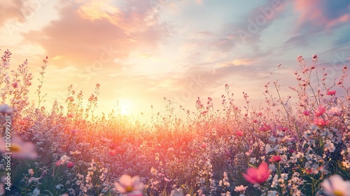 A dreamy meadow with wildflowers and a soft mist hanging in the air, under a pastel sky