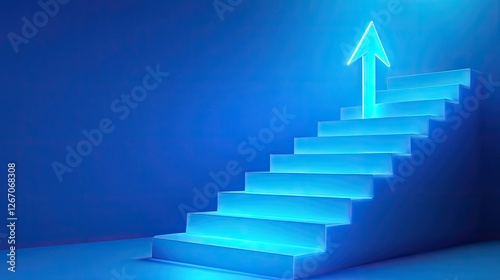 A D-rendered arrow climbing a set of glowing stairs, representing step-by-step progress, achievement, and personal growth.