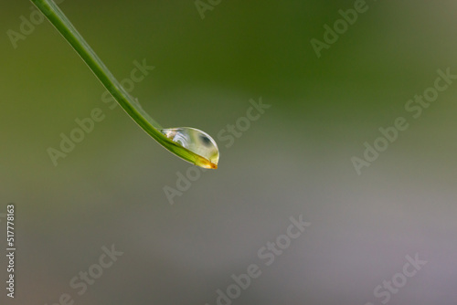 A drop of rain hangs from a leaf of a plant macro photography on a summer rainy day. A drop of water hanging on a leaf of a plant close-up photo.