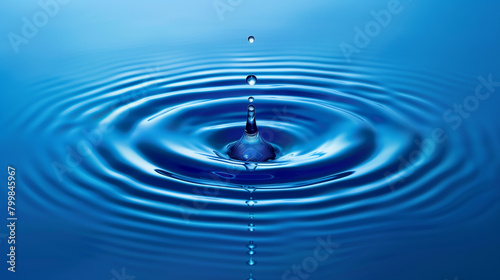 A drop of water is falling into a large blue wave. The water is calm and peaceful, with the drops creating a ripple effect in the water. Concept of tranquility and serenity