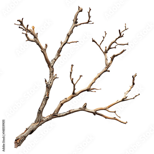 A dry tree branch shows detailed bark and limb texture on transparent background