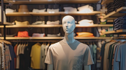a dummy mannequin wearing a simple colored t-shirt in a clean and premium t-shirt shop setting.