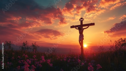 A dynamic 3D scene featuring a silhouette of Jesus on the cross at dawn The high-resolution image captures the interplay of light and shadow creating a powerful and contemplative mood The cross is