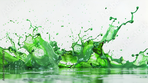 A dynamic and vibrant green liquid splashes in water, creating intricate patterns and droplets captured in sharp detail, paint on white background