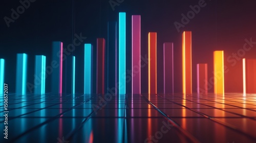 A dynamic bar graph with tall, shiny bars in blue and orange, standing on a reflective grid, symbolizing financial success and economic performance