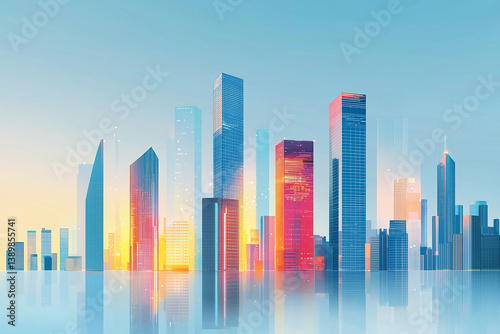 A dynamic business district with illuminated skyscrapers and a futuristic city skyline in vibrant neon colors, showcasing a modern architectural perspective in flat design.