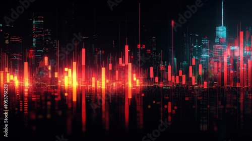 A dynamic candlestick chart showcases market fluctuations, with red and green bars illustrating price movements. This digital representation highlights trading activity and trends.