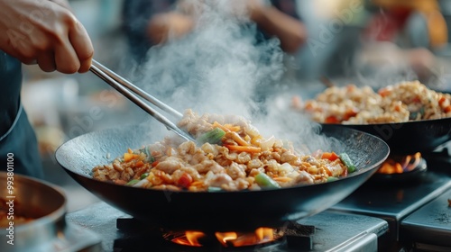 A dynamic cooking scene showcasing a chef using tongs to stir fry a mix of colorful vegetables and meat in a wok, with steam rising and adding to the vibrant kitchen atmosphere.