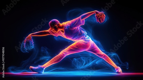 A dynamic, neon-colored image of a baseball pitcher in mid-throw, depicted with an artistic, glowing outline against a dark background