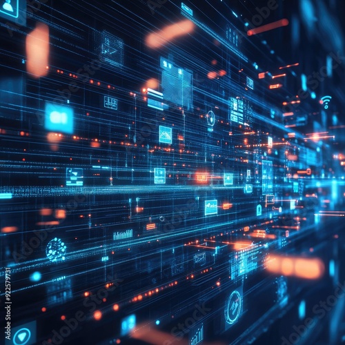 A dynamic representation of digital transformation, with technology icons and data flowing across a virtual landscape