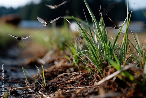 A dynamic scene capturing multiple birds in mid-flight above lush green grass, illustrating the beauty of nature in motion against a peaceful backdrop.
