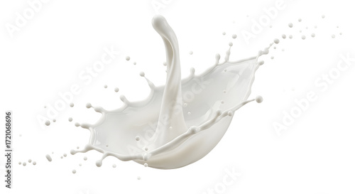 A dynamic splash of fresh white milk frozen in motion, creating a crown shape with droplets, isolated on a clean white background