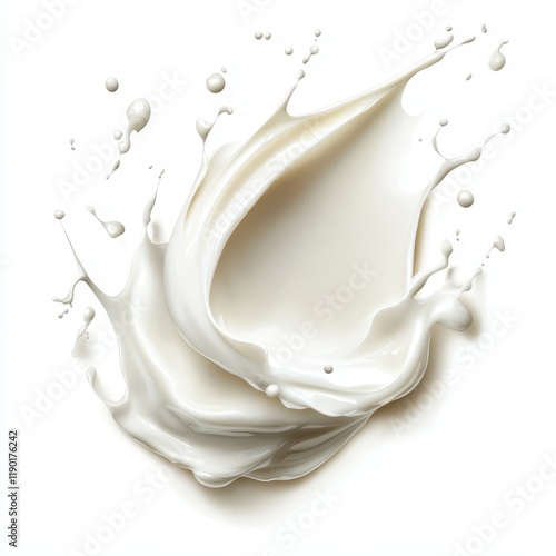 A dynamic splash of milk creates an artistic display against a pure white background, showcasing droplets that enhance the visual appeal.