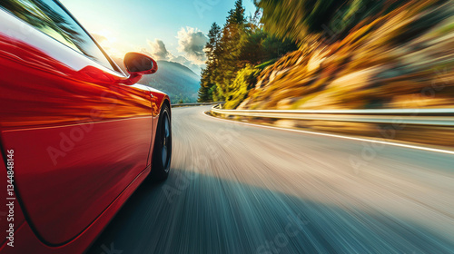A dynamic sports car speeding along a winding mountain road, with sleek aerodynamic design, vibrant motion blur, and a thrilling sense of power and freedom.
