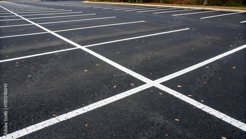 A dynamic view capturing freshly marked parking spaces the lines are a bright reflective white on the newly laid asphalt. Each space is evenly measured with invigorating contrasts