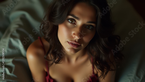 A Elegant portrait of a young woman with striking features looking thoughtfully into the lens