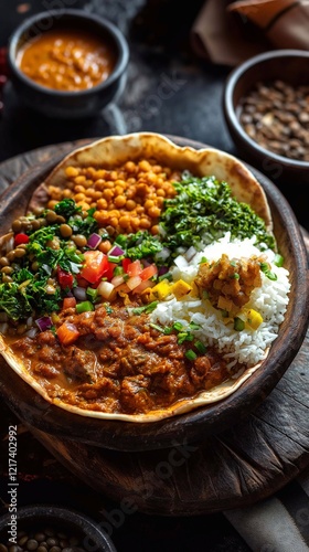 A Ethiopian platter with Injera bread topped with spicy Doro Wat chicken stew and sides of lentils and greens, vertical