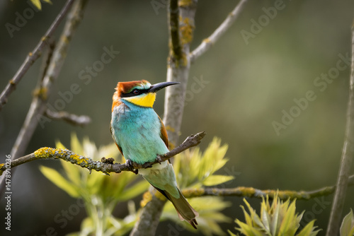 A European Bee-eater (Merops apiaster) on a branch in its natural environment.