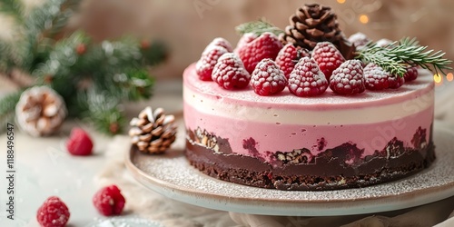 A extremely close shot chocolate raspberry mousse dessert with numerous layers and pine trees on soft beige background a large replicate room, Generative AI.