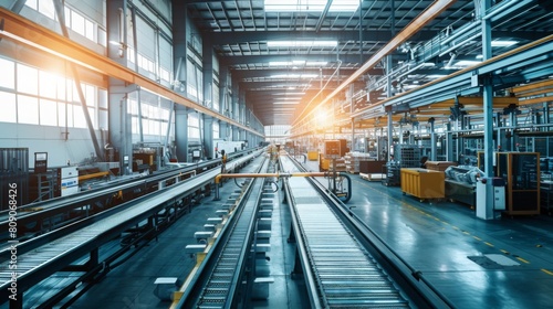 A factory interior with a conveyor belt running through the middle, transporting goods or materials for manufacturing processes.