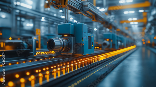 A factory with a camera on a conveyor belt. The camera is surrounded by orange lights. Scene is industrial and mechanical