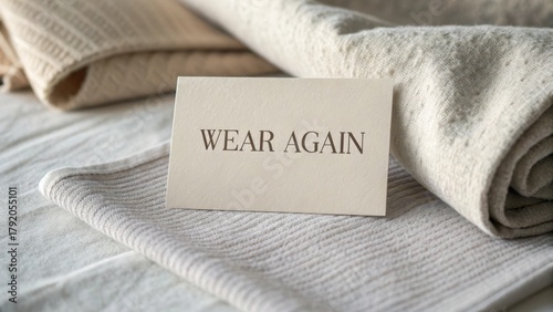 A faded fabric texture background with Wear Again card
