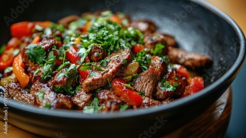A fajita skillet with sizzling beef, colorful vegetables, and garnished with fresh herbs