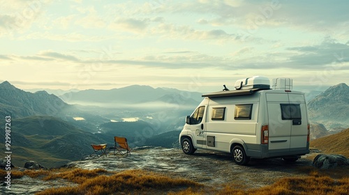 A family camper van, equipped with modern comforts, stands parked at the edge of a scenic landscape, poised for a new adventure.