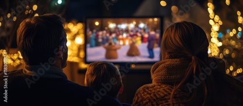A family gathered outdoors at night cozy and relaxed watching a movie projected on a screen surrounded by twinkling lights and holiday a festive joyful atmosphere of time spent with loved ones