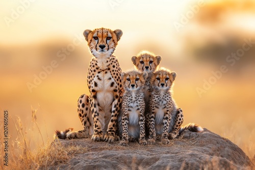 A family of cheetahs sitting on a rocky hill in the late afternoon sun, overlooking the plains of Zimbabwe