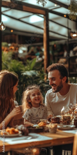 A family of three, a man, a woman and a child, are sitting at a table in a restaurant. Scene is happy and joyful