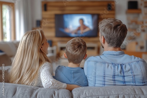 A family of three relaxes on a comfortable couch, facing a television that displays a movie. The warm indoor setting creates a cozy atmosphere as they enjoy quality time together.