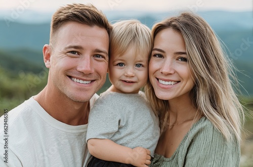 A family photo of the happy man, woman, and their baby in green against a beautiful natural landscape