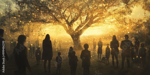 A family tree visualization features real people, with a close-up on generations connecting, as an outdoor setting with soft light highlights heritage