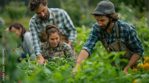 A family working together in a permaculture garden, illustrating community involvement in sustainable agriculture