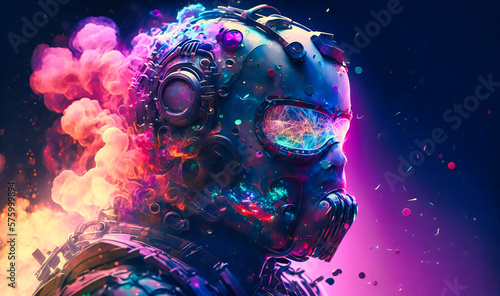 A fantastical portrait of a robot bursts with color, as if the cosmos itself exploded into a stunning digital canvas