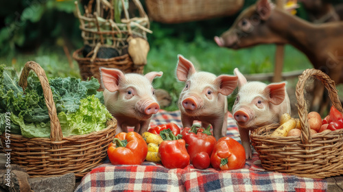 A farm picnic scene with piglets exploring around a checkered blanket and baskets of vegetables