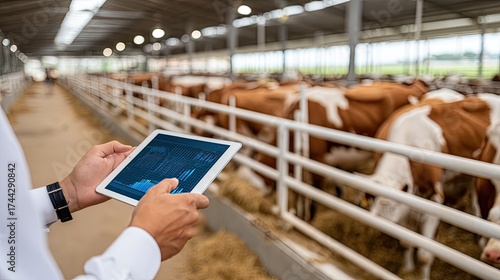 farmer, tablet, dairy, cow, barn, farm animal, agriculture, datum, management, animal, health, farming, technology, modern, monitoring, herd, eat, sustainability, productivity, vet, equipment, care, rural, innovation, milking, cattle, farm, life, digital, cow, industry, tool, welfare, breeding, pasture, veterinary, tracking, agricultural, grain, forage, nourishment, climate, control