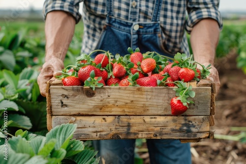 A farmer holds a box of ripe strawberries during the summer harvest. Summer symbol