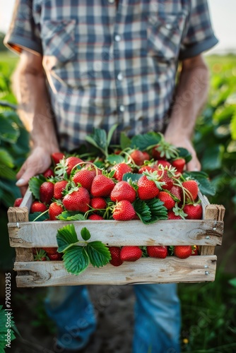 A farmer holds a box of ripe strawberries during the summer harvest. Summer symbol