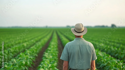 A farmer inspecting crops in a vast field of green, with a focus on sustainable farming practices and a healthy environment.