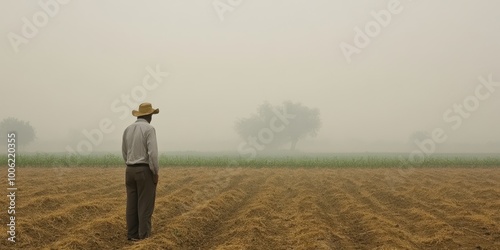 A farmer stands in a foggy field, surveying the landscape with uncertainty. The atmosphere is quiet and contemplative.