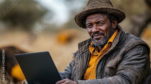 farmer, laptop, farm animal, technology, field, agriculture, modern, management, farming, digital, integration, innovation, traditional, crop, device, precision, monitoring, rural, hat, old, senior, person, people, elderly, cowboy, face, man, fashion, smile, grandfather, cap, beard, photogenic, outdoors, guy, 1, looking, computer, smiling, mature, woman, retirement