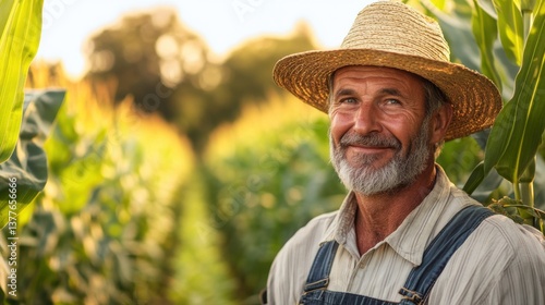 A farmer wearing a straw hat and overalls smiles while standing in a cornfield during sunset. The warm light casts an inviting glow on the landscape, highlighting the lush corn plants surrounding him