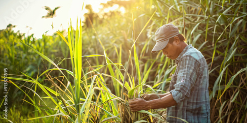 farmer, field, agriculture, harvest, crop, man, working, rural, farm, countryside, plantation, labor, work, farming, life, agribusiness, scene, farmland, grow, labourer, dirtied, green, sun, sunlight, sky, grass, leaf, plant, hat, shirt, back, standing, looking, landscape, nature, outdoors, day, summer, gold, warm, natural, lifestyle