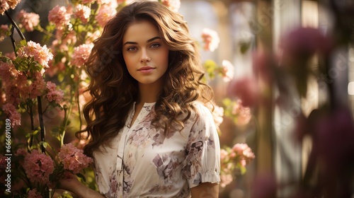 A fashion model in springtime attire that includes flowers.