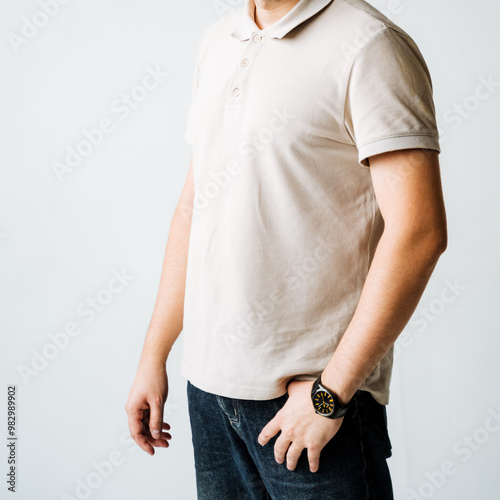 A fashionable man is elegantly dressed in a trendy white polo shirt paired with a sleek, modern watch, creating a chic and casual appearance that is perfect for a variety of occasions