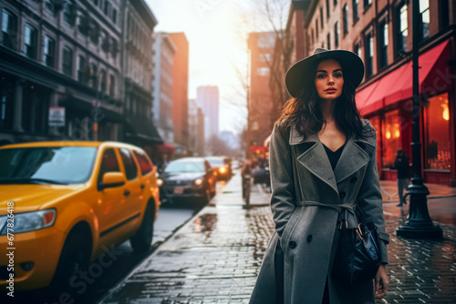 fashionable, woman, trenchcoat, hat, city, street, taxi, urban, confident, chic, style, elegance, bustling, modern, pedestrian, trendy, cosmopolitan, downtown, lifestyle, walk, sophisticated, glamour, casual attire, commute, city landscape, tied-up, atmosphere, poise, autumn, vibrant, travel, flair, contemporary, metropolitan, sidewalk, rush, smart, dynamic, classic, designer, sewing, independent, bold, active