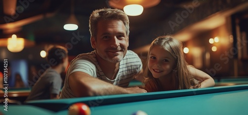father, daughter, pool, table, leisure, game, fun, smile, bonding, night, indoor, activity, family, joy, entertainment, friends, laughter, children, play, atmosphere, social, relaxation, interaction, happiness, together, enjoyment, youth, light, casual attire, friendship, excitement, connection, sport, skill, competition, challenge, sharpened, teamwork, strategy, innocence, warmth, memory, lifestyle, engagement, playful, environment, celebration, moment, life events