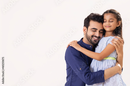 father, daughter, indian, happy, embracing, two together, loving, caring, affection, cheerful, copy space, enjoyment, togetherness, family, satisfied, modern, lifestyle, well-dressed, fashionable, blue shirt, frock, expressive, hugs, warmth, exhilaration, excited, guardian, protective, fulfillment, enthusiastic, girl, eyes closed, real people, white background, half face, adult, children, asian, horizontal, half-length, studio